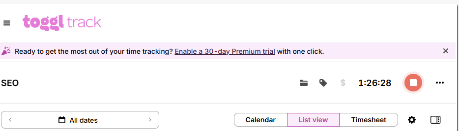 Vậy nên mình đổi sang một cách đơn giản hơn: tracking time bằng Toggl Track: Time Tracking Software for Any Workflow . Đây là 1 website hoàn toàn miễn phí và bạn có thể đồng bộ trên nhiều thiết bị.
